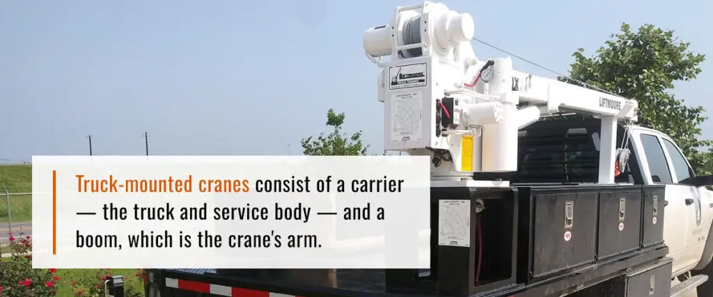 Truck-mounted cranes consist of a carrier — the truck and service body — and a boom, which is the crane’s arm. With this setup, you can move the crane wherever you need to. You can also fit your truck with outriggers and counterweights for stabilization.