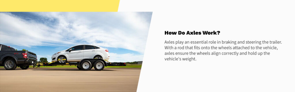 Axles play an essential role in braking and steering the trailer. With a rod that fits onto the wheels attached to the vehicle, axles ensure the wheels align correctly and hold up the vehicle’s weight. The size, type or number of axles often determine how much weight the trailer can handle and the vehicle’s load capacity.