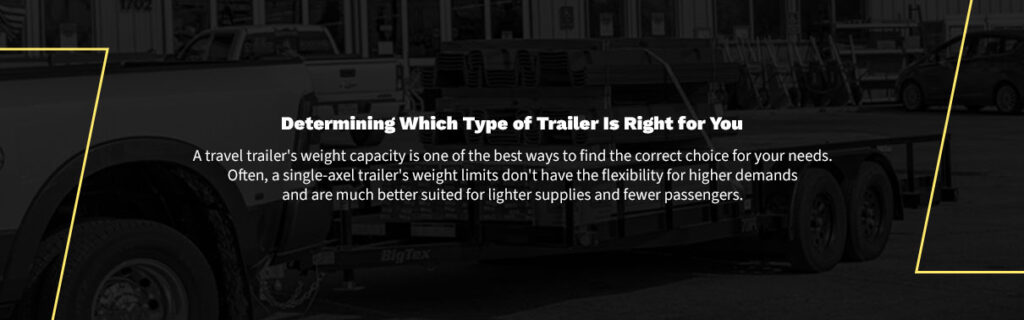 A travel trailer’s weight capacity is one of the best ways to find the correct choice for your needs. Often, a single-axel trailer’s weight limits don’t have the flexibility for higher demands and are much better suited for lighter supplies and fewer passengers. On the other hand, double-axle trailers can handle heavy weights and more passengers.